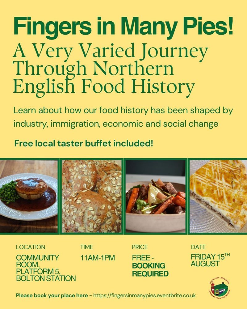 On Friday the 15th of August South East Lancashire Community Rail Partnership hosted a local food heritage talk in the Community Room on Platform 5 at Bolton Station. Titled ‘Fingers in Many Pies’, the talk was led by part-time Community Rail Officer Emily Oldfield and focused on the fascinating food history along our lines, complete with a complimentary local taster buffet for attendees.