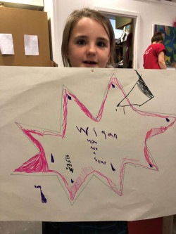 Part of the Celebrating Wigan project involved asking locals what they loved most about Wigan. The hearts and stars that you see in this piece are artworks by Amelia and Poppy from Wigan Youth Zone. When encouraged to create art based on Wigan they used phrases like ‘Wigan, you are a star’, putting the words ‘pie’ inside love hearts and using lots of vibrant colours in their work.